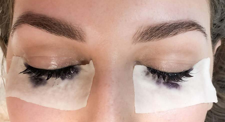 محافظت از مژه (ناحیه زیر چشم): پدهای زیر چشم (پدهای نعل اسبی شکل یا حتی پدهای پنبهای بریدهشده) را به وازلین آغشته کنید. سپس پد را به آرامی زیر مژههای پلک پایین بچسبانید، به طوری که تمام مژههای پایین را بپوشاند و رنگ نتواند با پوست پلک تماس پیدا کند.
